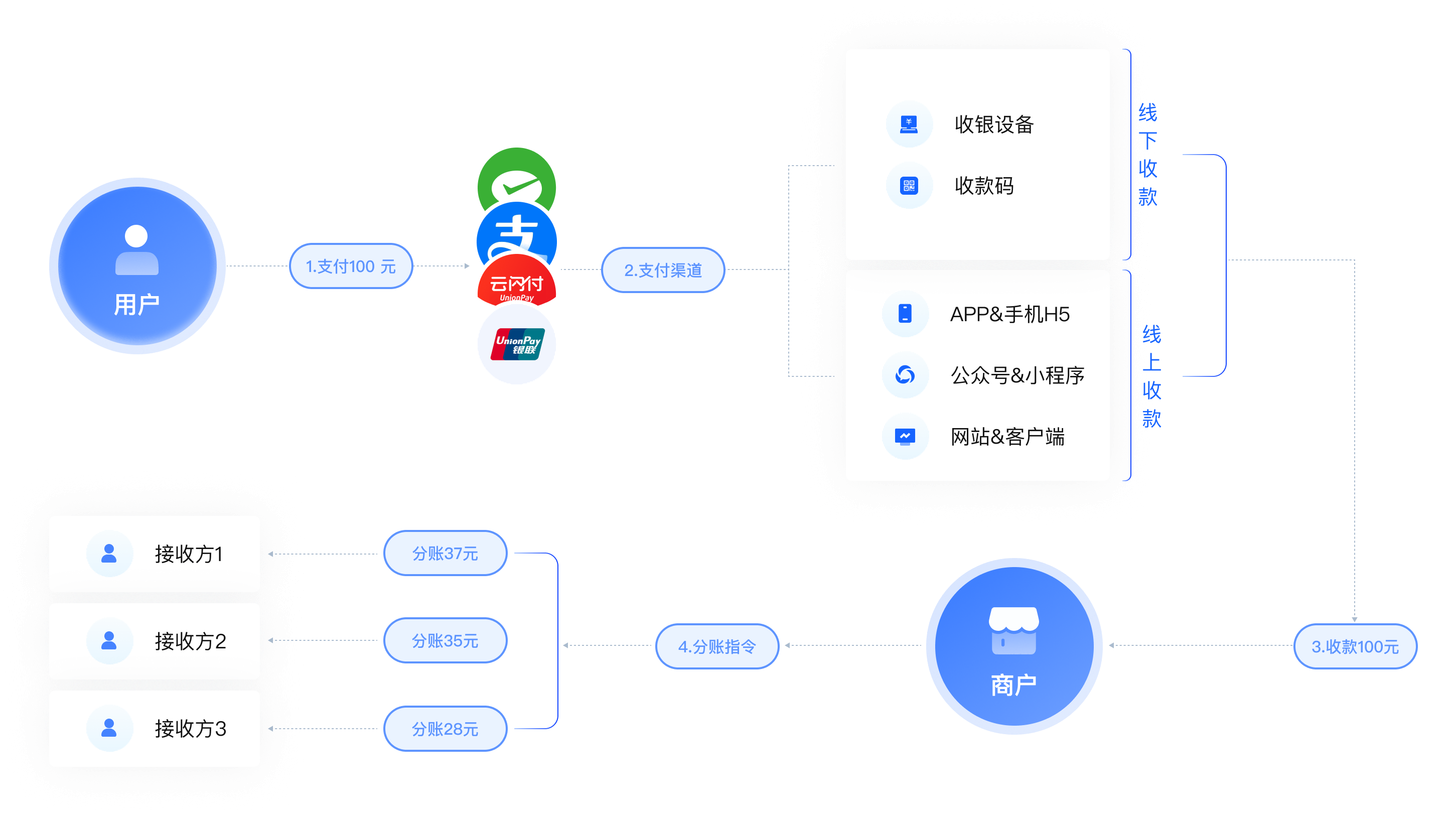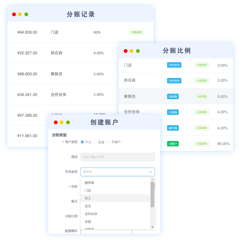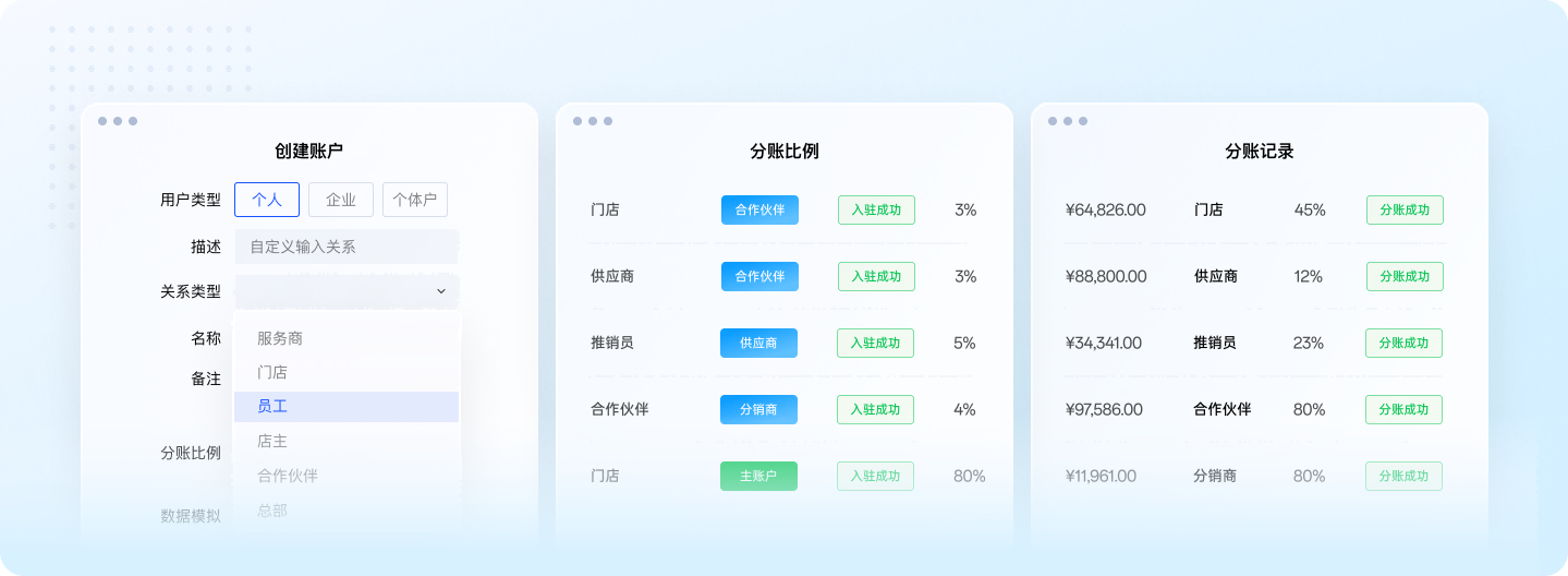 支持分账至企业、个体与个人账户,通过实时、延时、固定或按比例分