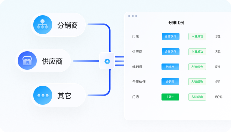灵活高效拓展模式通过接口集成后,根据业务需求对每笔订单做不同的分账比例等配置规则,上传分账指令进行自定义分账。
